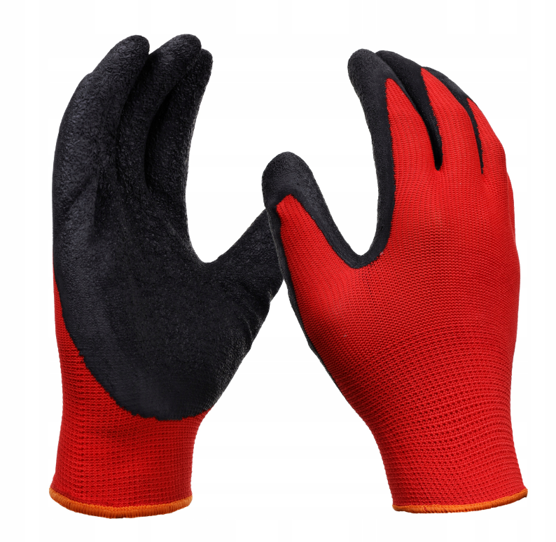 Pracovní ochranné rukavice Nakida R2001, latex, červeno-černé, vel. 10 (XL) jsou univerzální pracovní rukavice určené pro široké spektrum použití v průmyslu, stavebnictví, dopravě, skladování, zemědělství, zahradnictví i tesařství. Rukavice jsou vyrobeny z kvalitní červené polyesterové tkaniny, která zajišťuje vysokou pružnost a komfort při nošení. Úchopová část je potažena měkkým, ale odolným latexem v černé barvě, který chrání dlaně a prsty před oděrem a zajišťuje vynikající přilnavost i při práci s kluzkými nebo mokrými předměty.